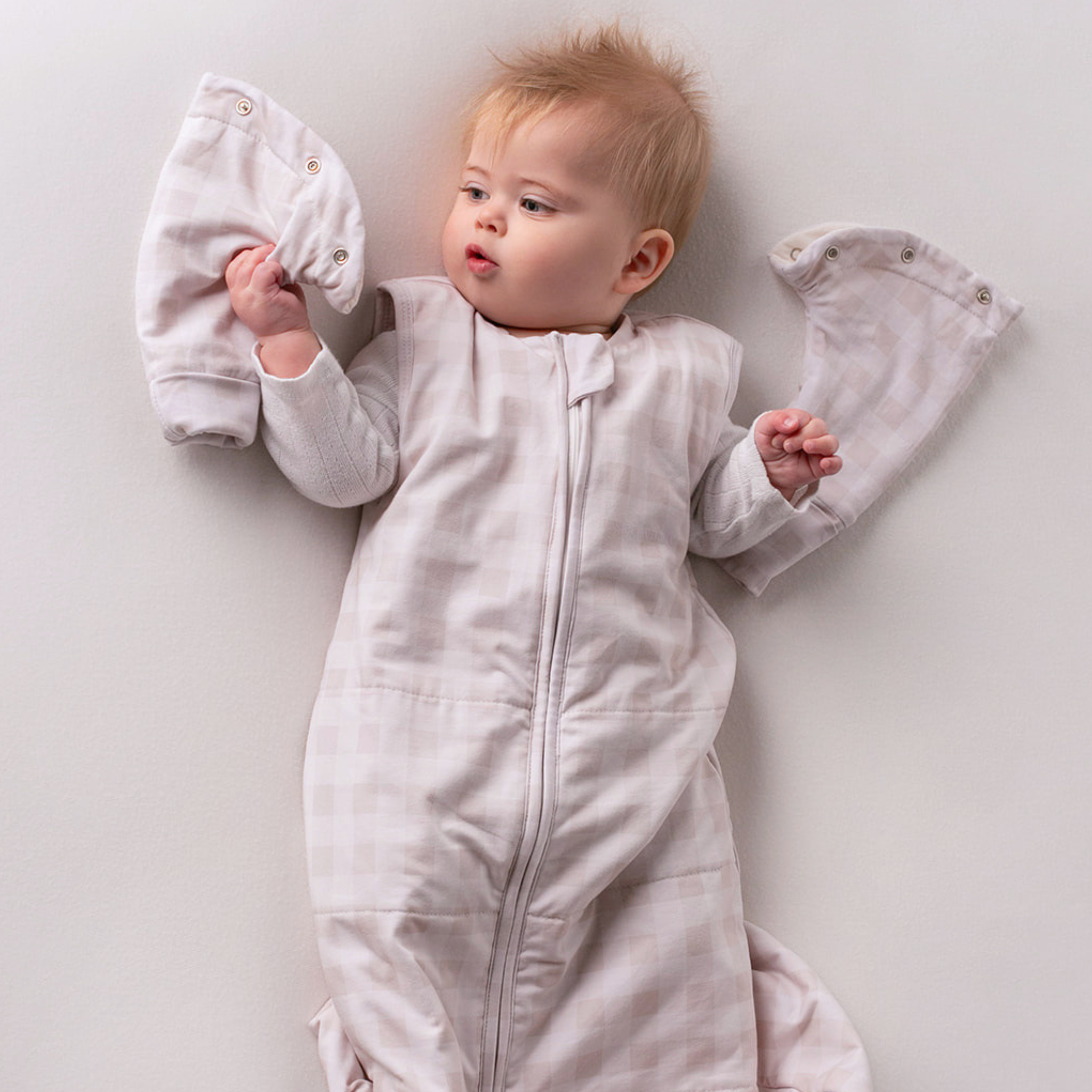 Use sleeves to match the room, not a fixed rule. In cooler rooms, keep sleeves on. In warmer rooms, take sleeves off. Check your baby’s chest or the back of the neck to judge comfort, warm is right, hot or sweaty means remove a layer. Follow TOG guidance, lower TOG for warm weather and higher TOG for cool weather.