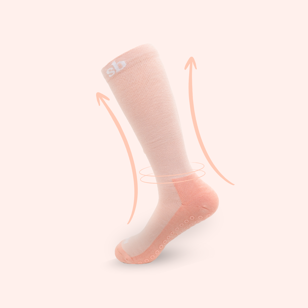 Our compression socks are made with grade 1 compression meaning you can wear them for longer periods of time (cease use if you feel discomfort). We recommend putting them on 30-minutes before you get into bed to help with the swelling before you get into bed and then sleep with them overnight OR if you don’t want to wear them to bed, take them off as you're about to go to sleep.