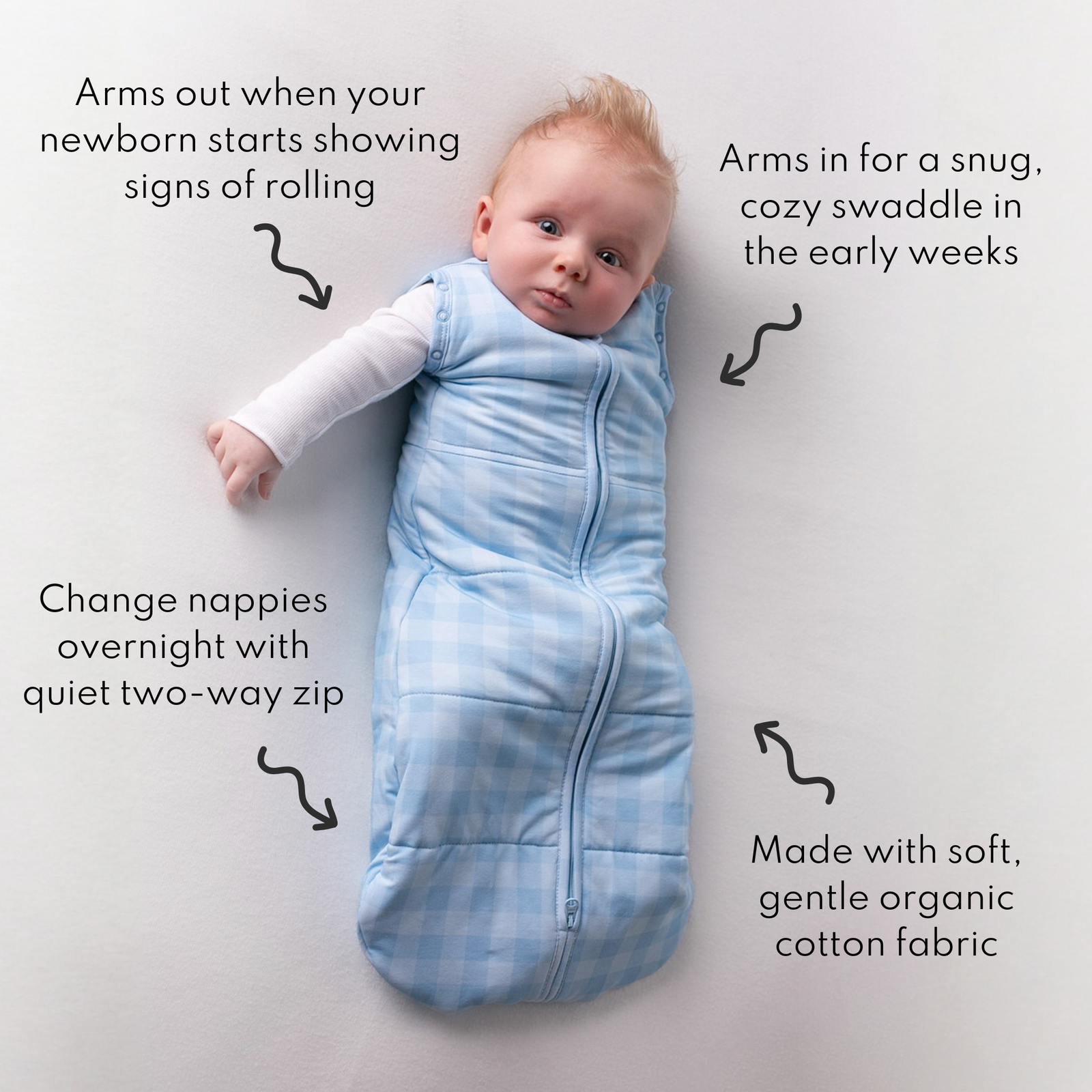 So soft that the moment you touch it, you’ll understand. Made from organic, breathable cotton with gentle stretch, it sits calmly against baby’s skin and stays smooth wash after wash.
